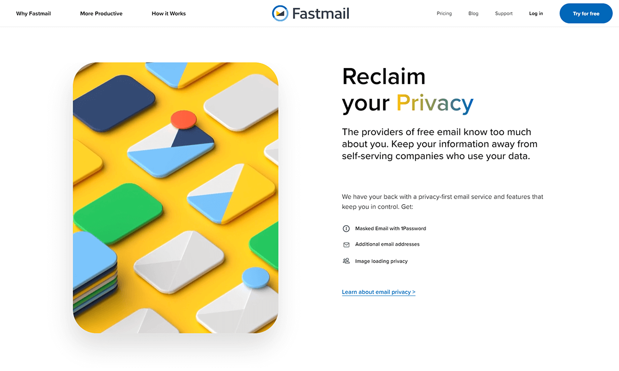 The new site is designed as a lead generation tool. It showcases why Fastmail exists, how it puts users in control of their email privacy, and how it helps them be more productive.